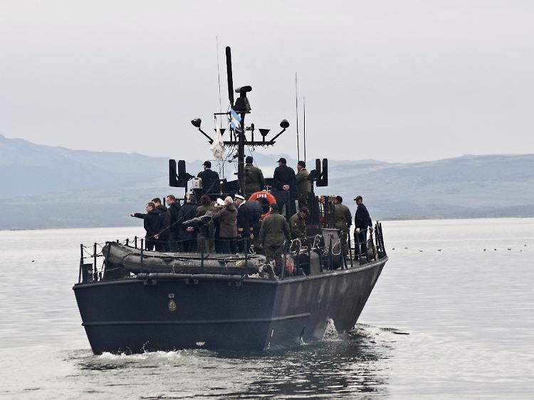 Auf einem argentinischen Boot wird die Kommission auf das Schulschiff gebracht.