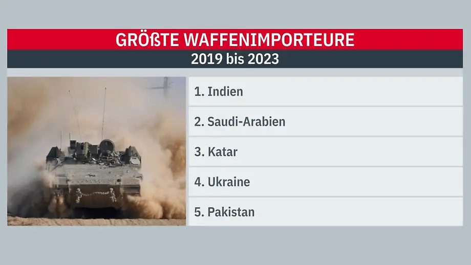 Größter Importeur in Europa war dabei die Ukraine - mit 23 Prozent der gesamten Waffeneinfuhren der Region. Seit zwei Jahren wehrt das Land einen Angriffskrieg Russlands ab. Allein im Jahr 2023 war die Ukraine mit Abstand der größte Waffenimporteur der Erde.