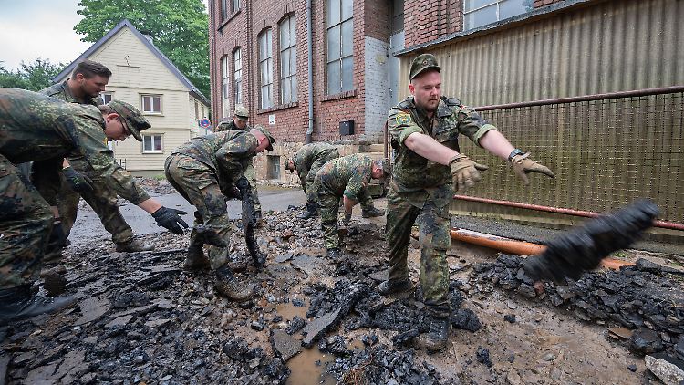 Unter anderem helfen 200 von ihnen mit 20 Lkw und zwei Bergepanzern bei den Aufräumarbeiten im nordrhein-westfälischen Hagen. In der Stadt Daun in der Vulkaneifel werden mithilfe von schwerem Gerät Straßen geräumt, in Leverkusen befüllen 200 Soldaten Sandsäcke.