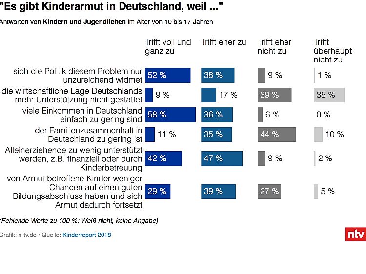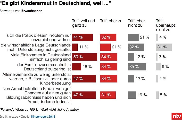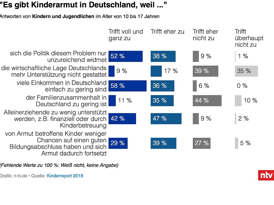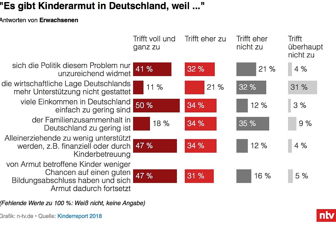 Die nach Meinung der Mehrheit zentrale Ursache für Kinderarmut ist banal: zu geringe Einkommen. 84 Prozent der befragten Erwachsenen sagte, dies treffe "voll und ganz" beziehungsweise "eher" zu. Auch Kinder und Jugendliche wurden dazu befragt, von ihnen sagten dies 94 Prozent. Zudem sind 90 Prozent der Erwachsenen und 89 Prozent der Kinder und Jugendlichen der Ansicht, Kinderarmut werde dadurch begünstigt, dass die Politik das Thema vernachlässigt.