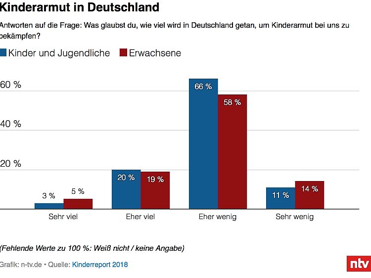 So halten die weitaus meisten Befragten die bisherigen Maßnahmen von Staat und Gesellschaft nicht für ausreichend. Nur 5 Prozent sagen, dass "sehr viel" für die Bekämpfung der Kinderarmut getan wird. Aus Sicht von 19 Prozent wird "eher viel" getan. Drei Viertel sehen das jedoch anders. 58 Prozent sagen, bei diesem Thema werde "eher wenig" getan, für 14 Prozent ist es "sehr wenig".