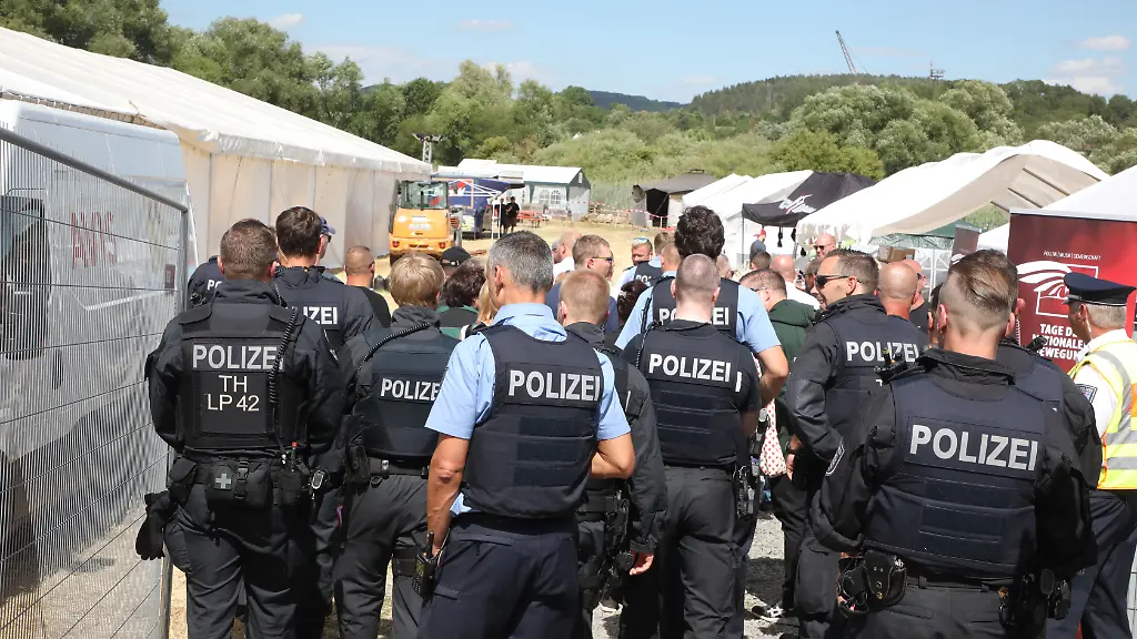 Die Beamten in Thüringen nehmen mehr als 40 Anzeigen bei dem rechtsextremen Festival in Thüringen auf. Vornehmlich wegen unzulässiger Kennzeichen und Tätowierungen. Gestört wird das Festival zudem von fast so vielen Gegendemonstranten, wie es Teilnehmer gibt.