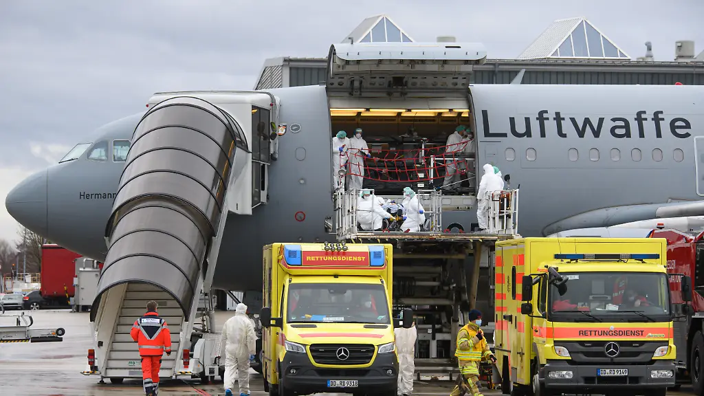 Die Maschine vom Typ Airbus 310 der Flugbereitschaft der Bundeswehr ist eine Art fliegendes Krankenhaus, um Verletzte von überall aus der Welt nach Deutschland zu bringen. Der Luftwaffenjet bietet Platz für bis zu sechs Intensivversorgungsmodule und bis zu 38 Liegeplätze für weniger schwer Verletzte oder aber maximal 56 Liegeplätze.