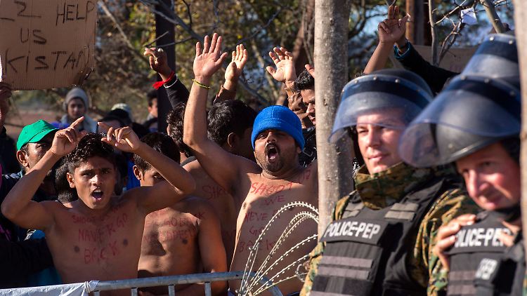 Hunderte Flüchtlinge haben mit spektakulären Protesten auf ihre Abweisung an der griechisch-mazedonischen Grenze bei Gevgelija reagiert. Einige nähten sich den Mund zu, während andere Männer sich auf Englisch die Worte "Nur Freiheit" und "Iran" auf Brust und Stirn schrieben. Zudem drohten sie mit einem Hungerstreik.