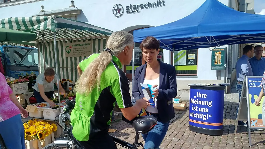 Weniger turbulent geht es am Wahlkampfstand von Frauke Petry direkt neben der Gemüsehändlerin zu. Auf einem Plakat präsentiert sich die 44-Jährige ein bisschen wie die Inka Bause der Politik: burschikos mit gestylter Kurzhaarfrisur, sitzend mit aufgestütztem Kopf. Ihre Botschaft lautet: "Konservativ. Aber anständig". Gemeint ist: Wir sind wie die alte AfD, bevor sie sich radikalisierte und gehässig wurde.