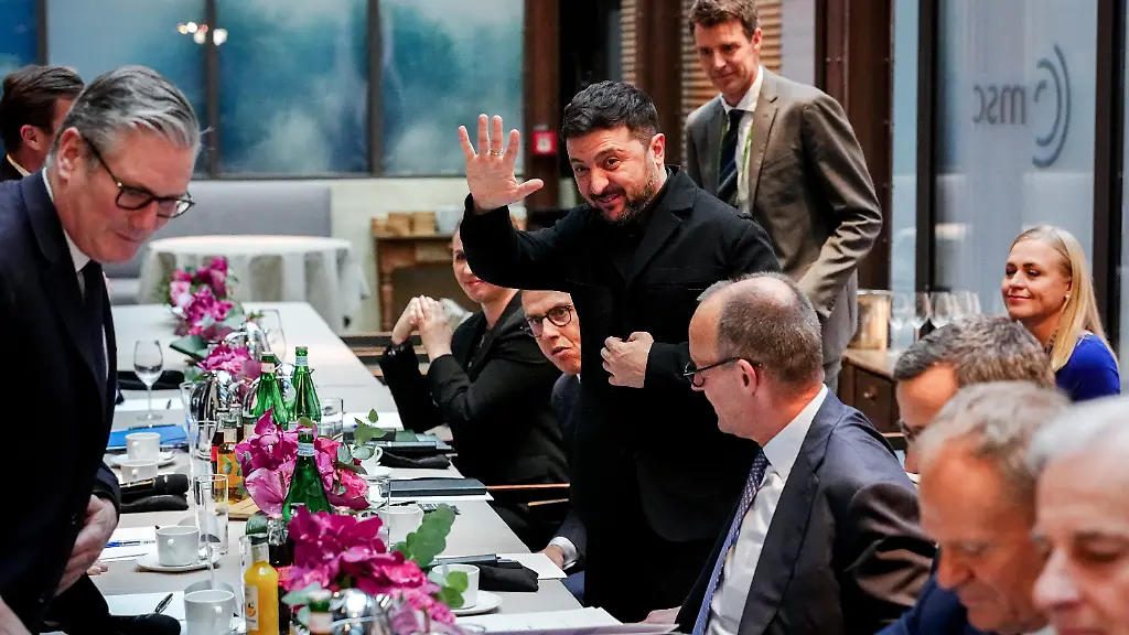 MUNICH-GERMANY-FEBRUARY-13-British-Prime-Minister-Keir-Starmer-L-Finnish-President-Alexander-Stubb-Ukrainian-President-Volodymyr-Zelensky-waving-German-Chancellor-Friedrich-Merz-4th-R-Polish-Prime-Minister-Donald-Tusk-2nd-R-and-Norwegian-Prime-Minister-Jonas-Gahr-Store-R-attend-a-Berlin-format-meeting-at-the-62nd-Munich-Security-Conference-on-February-13-2026-in-Munich-Germany-The-conference-which-brings-together-government-leaders-security-experts-and-defence-ministers-is-taking-place-at-a-time-when-the-traditional-western-political-and-military-alliance-is-facing-rupture-due-to-the-policies-of-U-S-President-Donald-Trump