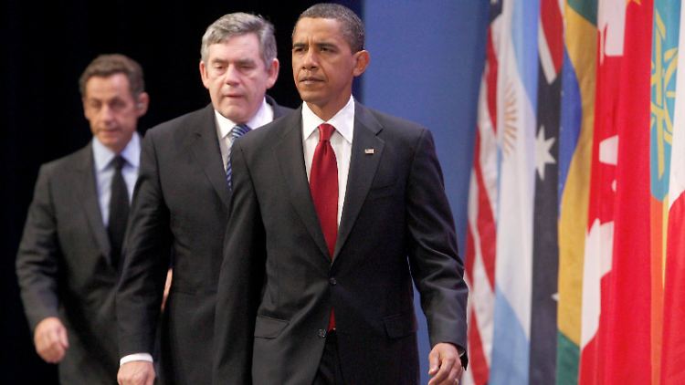 US-Präsident Obama bezieht zusammen mit Frankreichs Präsident Sarkozy (links) und Großbritanniens Premier Brown Stellung.