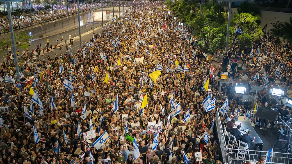 Nach dem Fund der sechs Leichen nahmen Zehntausende Israelis an einer Protestkundgebung in Tel Aviv teil. Zahlreiche Demonstranten marschierten mit blau-weißen Nationalflaggen auf zentralen Straßen der Stadt am Mittelmeer. Auf einer Bühne waren symbolisch die Särge der sechs Geiseln aufgebahrt. In Tel Aviv blockierten Demonstranten eine zentrale Schnellstraße. Auch in anderen Städten kam es zu Protestaktionen. In Jerusalem blockieren Demonstranten Straßen und protestieren vor der Residenz Netanjahus. Luftaufnahmen zeigen, wie die Hauptautobahn von Tel Aviv von Demonstranten blockiert wird. Manche halten Bilder der getöteten Geiseln hoch.
