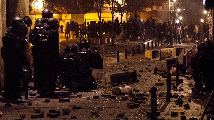 Bei den Auseinandersetzungen blockierten Demonstranten Straßen im Viertel Lavapiés. Sie warfen Steine und Flaschen auf einen Feuerwehrwagen und auf Polizeibeamte, die Sicherheitskräfte setzten unter anderem Gummikugeln ein. Mülleimer und Fahrräder gingen in Flammen auf.
