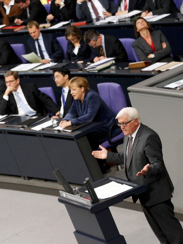 SPD-Fraktionschef Frank-Walter Steinmeier betonte in seiner Erwiderung auf Merkel, wenn die SPD sich zu einer gemeinsamen Erklärung im Parlament mit der Koalition bereitfinde, tue sie das aus Verantwortung für Europa, nicht um die schwarz-gelbe Regierung zu stützen.
