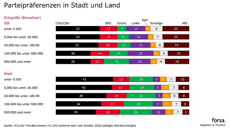 So liegt die Union im Westen vor allem auf dem Land, in Gemeinden mit weniger als 5000 Einwohner und Gemeinden zwischen 5000 bis unter 20.000 Einwohnern bei 43 beziehungsweise 42 Prozent. Im Osten liegt die CDU ebenfalls in allen Gemeinden unter 100.000 vorn, das aber mit nur knapp über 30 Prozent. Zweitstärkste Kraft auf dem Land ist in den ostdeutschen Ländern die AfD, der dort jeder fünfte Befragte zuneigt.
