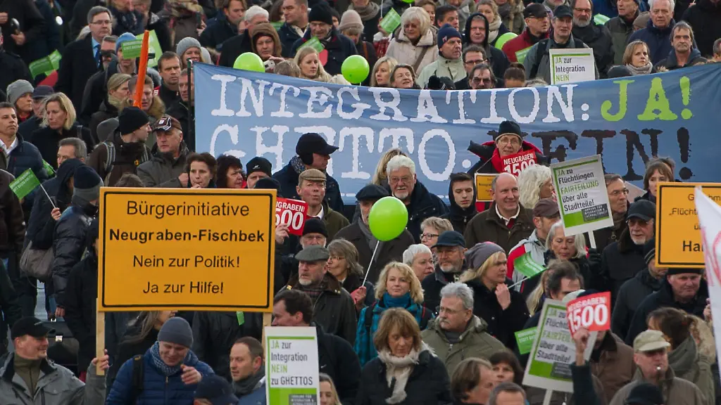 Mehrere hundert Menschen haben in Hamburg gegen ihrer Ansicht nach zu große Flüchtlingsunterkünfte protestiert. Die Polizei schätzte die Zahl der Demonstranten am Donnerstag auf gut 500, Teilnehmer sprachen von rund 750. Zu dem Protestzug unter dem Motto "Integration JA, Olaf-Scholz-Ghettos NEIN" hatte ein Dachverband von sieben Bürgerinitiativen aufgerufen.