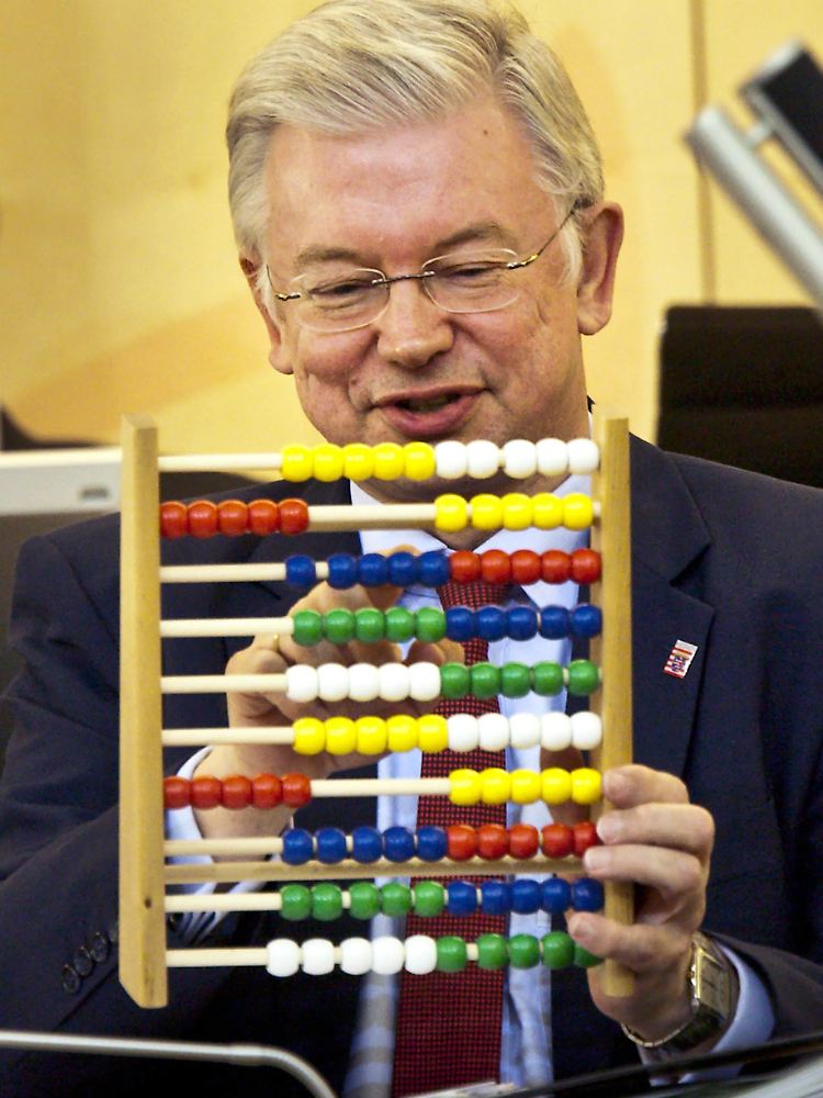 Koch hat nachgerechnet: Der Ministerpräsident mit einem Abakus, den er im hessischen Landtag vom Oppositionsführer überreicht bekam.