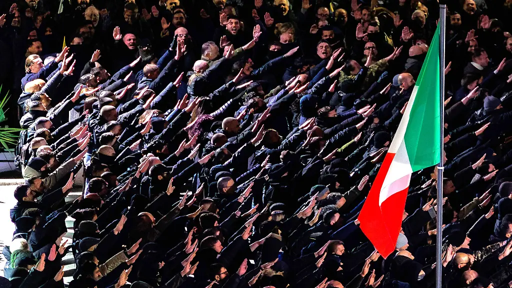In Italien ist das Zeigen des Faschistengrußes bei reinen Gedenkveranstaltungen erlaubt, wenn keine politische Absicht dahintersteckt. Das geht auf eine Entscheidung des obersten italienischen Gerichts aus dem Januar 2024 zurück. Wenn der "saluto romano" jedoch Teil einer politischen Aktion ist, die zum Ziel hat, die faschistische Partei wieder an die Macht zu führen, kann er bestraft werden. Bei Demonstrationen wie dieser sind die ausgestreckten Arme deshalb in der Regel erlaubt.
