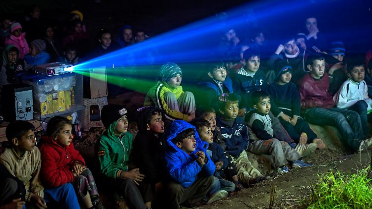 Ein wenig Ablenkung: Flüchtlingskinder schauen mit einem Beamer Cartoons - das Bild wird auf die Seite eiens Lieferwagens projeziert.