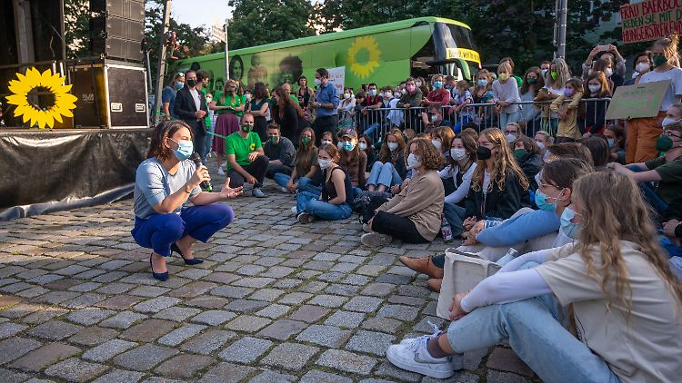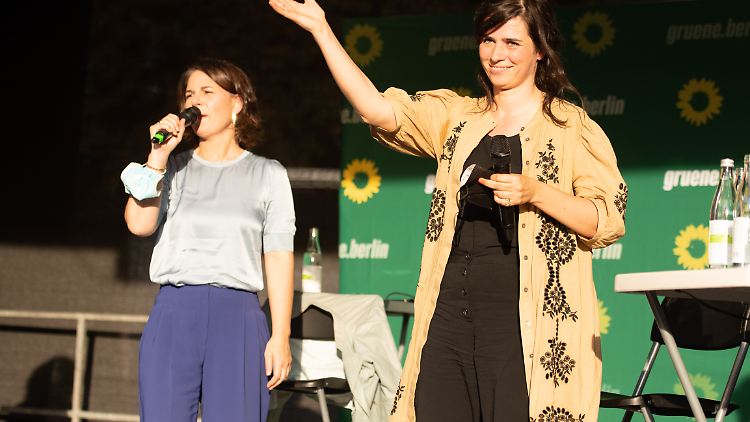 Die Partei hat sich prominente Unterstützung eingeladen, um ihre Botschaft zu vermitteln: Henning May, Frontmann der Erfolgsband "Annenmaykantereit", eröffnet die Veranstaltung auf dem Minna-Flake-Platz mit einem eigens dafür geschriebenen Song. Auch er kommt nicht um das Buzzword "Richtungswechsel" herum. "Zum Glück gibt es eine Kandidatin, die für etwas Neues steht - für einen sogenannten Richtungswechsel. Der ist schon so lang bestellt, und wurde nie abgeholt", singt der Kölner. Schauspielerin Nora Tschirner ist ebenfalls da. Die bekennende Baerbock-Unterstützerin soll beim "Paneltalk" mit Annalena Baerbock, Bettina Jarasch und Cordelia Koch, Bürgermeisterkandidatin für Pankow, aus ihrer Perspektive als Pankowerin und Mutter erzählen.