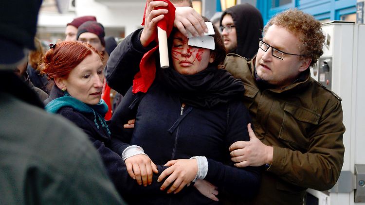 Eine verletzte linke Gegendemonstrantin wird nach einem Zusammenstoß mit der Polizei verarztet.