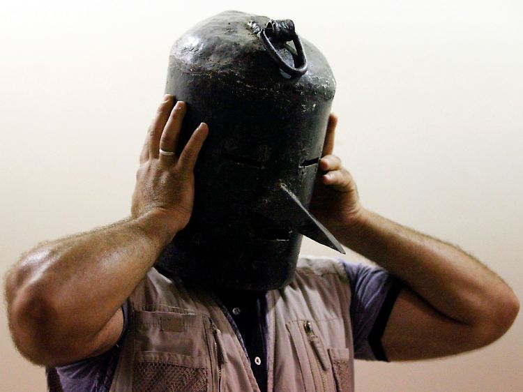 Saddam Husseins Folterinstrumente versetzen Menschen noch immer in Schrecken. Wohl auch diesen Besucher einer Ausstellung im Märtyrer-Denkmal in Bagdad, der es wagt, sich für einen Moment eine der gefürchteten Eisenmasken aufzusetzen.