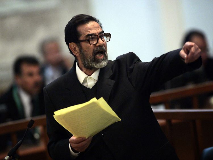 Saddam Hussein verteidigte sich vergeblich vor Gericht. 2006 wurde der frühere Diktator des Iraks wegen Massakern an Schiiten und Kurden zum Tode verurteilt und hingerichtet.
