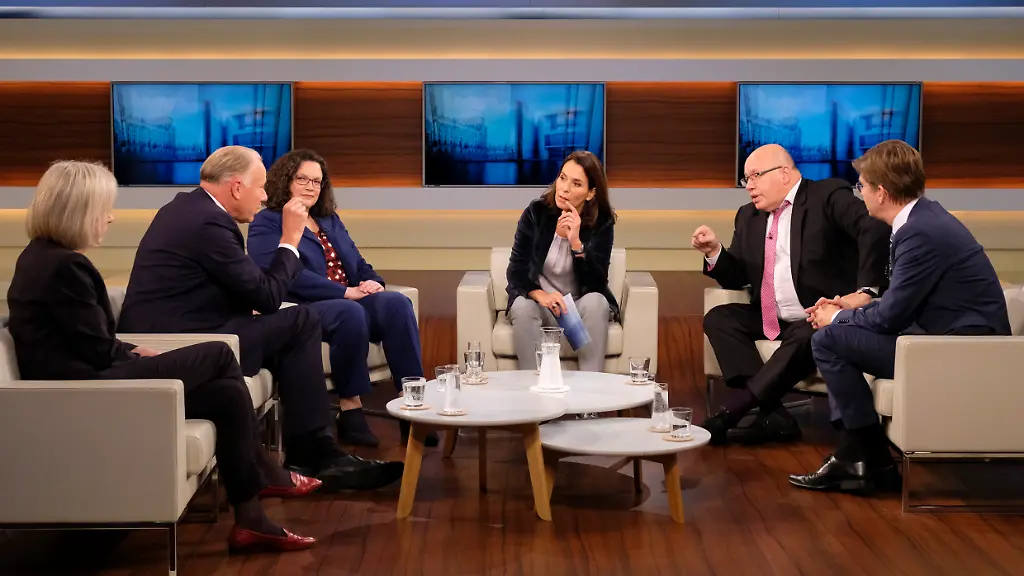 Es diskutieren die Partei- und Fraktionsvorsitzende der SPD, Andrea Nahles, Bundeswirtschaftsminister Peter Altmaier von der CDU, Jürgen Trittin von den Grünen, die Politikwissenschaftlerin Ursula Münch und der "Cicero"-Chefredakteur Christoph Schwennicke.