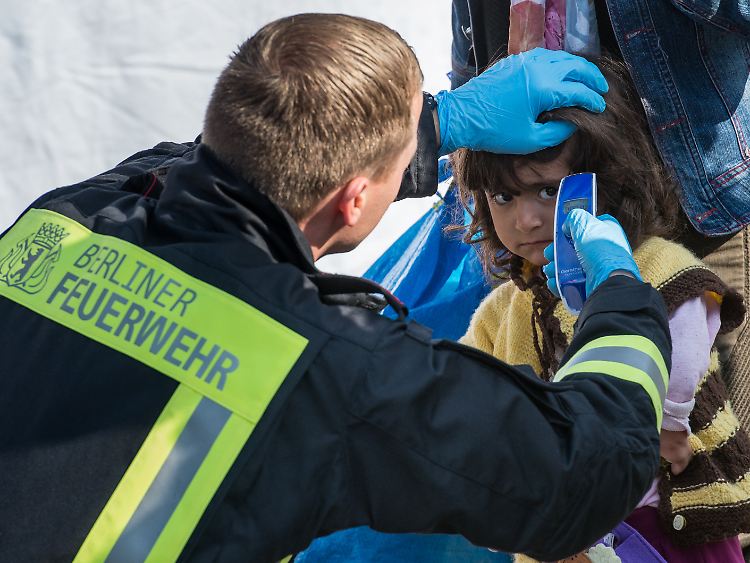 Reine Vorsichtsmaßnahme: Ein Berliner Feuerwehrmann prüft bei der Erstaufnahme die Körpertemperatur eines Flüchtlingsmädchens.