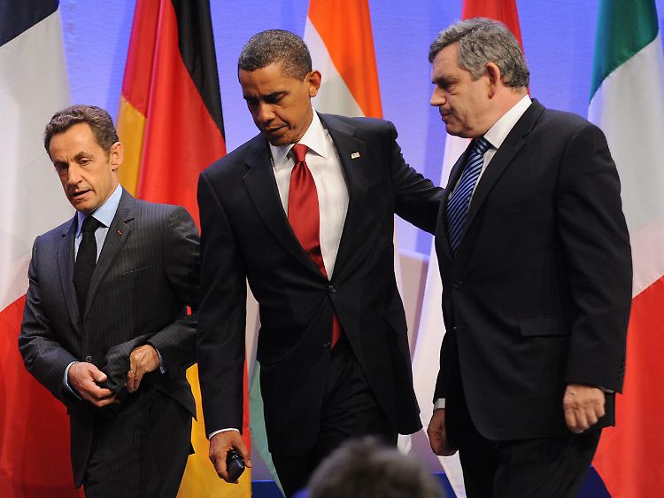 In einer gemeinsamen Erklärung verurteilten Frankreichs Präsident Sarkozy, US-Präsident Obama und Großbritanniens Premierminister Brwon (von links) Teheran.