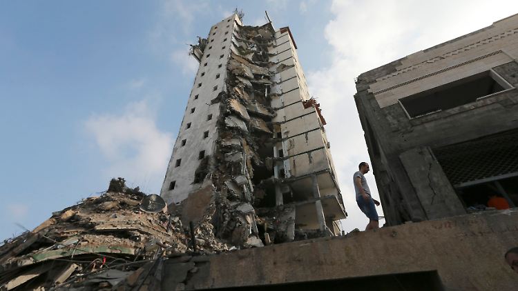 Die israelische Armee hat bei Luftangriffen auf den Gazastreifen eines der höchsten Wohn- und Geschäftshäuser des Küstenstreifens fast vollständig zerstört. Dabei wurden nach palästinensischen Angaben zwei Menschen getötet. 20 Personen seien verletzt worden. Als Warnung an die rund 70 Familien, die in dem 13-stöckigen Gebäude wohnten, hatte Israel in der Nacht zwei Raketen ohne Sprengsatz vorausgeschickt. Hunderte Nachbarn wurden evakuiert, um nicht durch einen befürchteten Einsturz des Gebäudes zu Schaden zu kommen.
