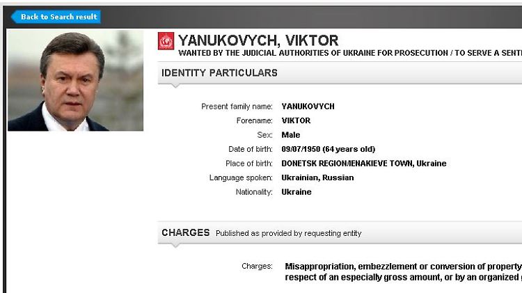 Die Aufnahme in die Interpol-Liste berechtige zu Janukowitsch' Auslieferung an die Ukraine, egal in welchem Land er in Gewahrsam genommen werde, erklärten die pro-westlichen ukrainischen Behörden. Sie beschuldigen den Ex-Präsidenten, sich gemeinsam mit Verwandten und Vertrauten auf Kosten der Staatskasse und durch korrupte Geschäfte bereichert zu haben. Janukowitsch hat die Vorwürfe zurückgewiesen. Russland erklärte nach seiner Flucht, Janukowitsch sei das Opfer eines faschistischen Staatsstreichs.