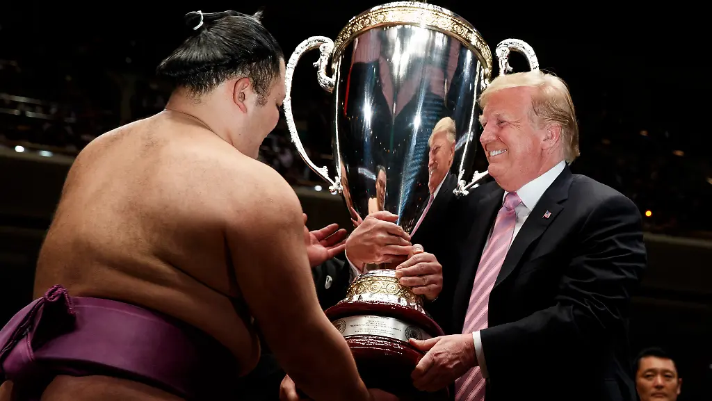 Ein lange gehegter Wunsch des Kampfsportfans Donald Trump ist bei seinem Staatsbesuch in Japan in Erfüllung gegangen. "Ich wollte schon immer Sumo-Ringen sehen", sagte der US-Präsident. In Tokio nahm er bei einem traditionsreichen Sommerturnier am Rande des Ringes Platz - und überreichte anschließend dem Überraschungssieger Asanoyama einen mehr als einen Meter hohen und 30 Kilogramm schweren Pokal. Die Trophäe solle nun lange Zeit jeweils an den Turniersieger übergeben werden, wünschte sich Trump.