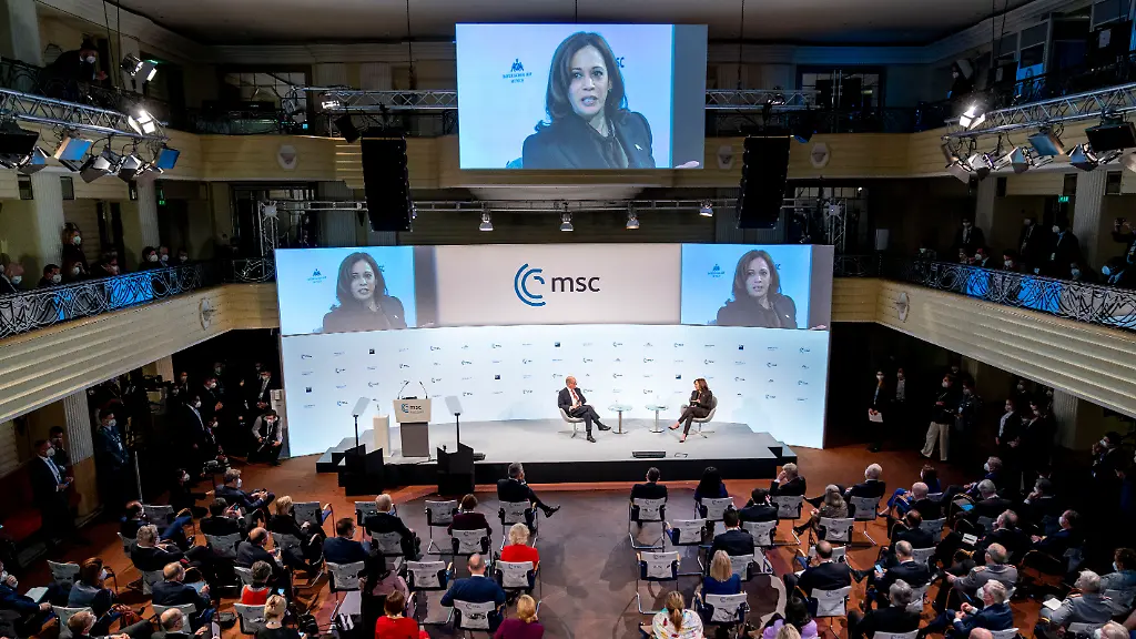 In der Ukraine sei die Grundlage der europäischen Sicherheit unmittelbar bedroht, sagte die Vizepräsidentin in München. Sie sprach dort unmittelbar nach Bundeskanzler Olaf Scholz und erstmals auf großer politischer Bühne in Europa.