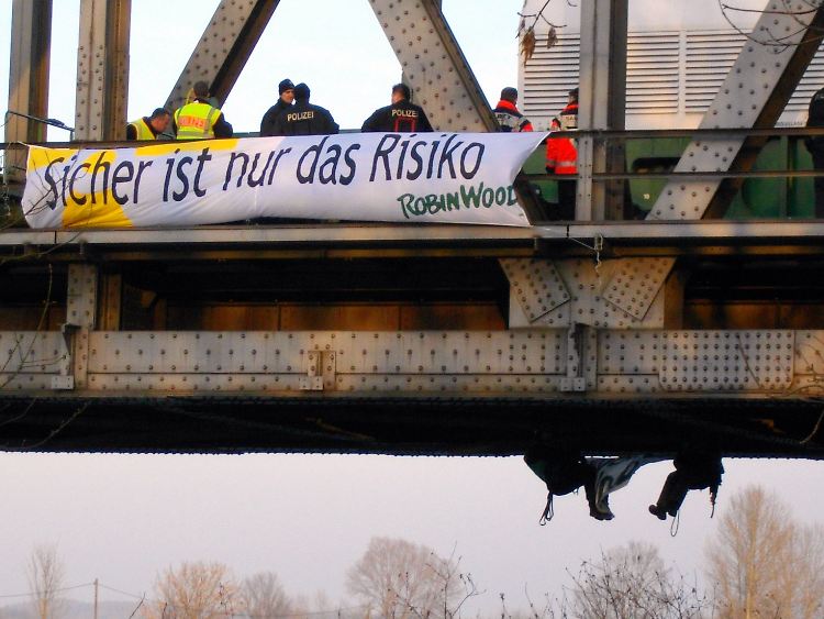 Bei dem Protest auf einer Eisenbahnbrücke über die Saale bei Halle hatten zwei Männer Stahlseile auf die Gleise gelegt und sich daran in die Tiefe abgelassen, wie die Umweltschutzorganisation Robin Wood und die Polizei mitteilten. Der Zug hielt auf der Brücke an, weil er sonst das Leben der beiden Männer gefährdet hätte. Die Polizei rückte mit Spezialkräften aus und beendete die Aktion der Demonstranten, die nun mit einer Anzeige wegen gefährlichen Eingriffs in den Bahnverkehr rechnen müssen. "Das ist kein Kavaliersdelikt", sagte der Sprecher der Bundespolizei, Stefan Perschall.