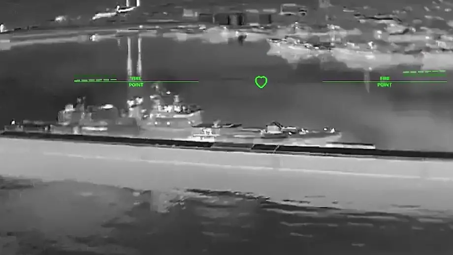 In dem Clip ist zu sehen, wie sich eine Drohne im Nachtsichtmodus dem Kriegsschiff im Hafen nähert. Kurz vor der Kollision bricht die Aufnahme ab. Ob und wie stark die "Admiral Makarow" bei der Attacke beschädigt wurde, ist unklar.