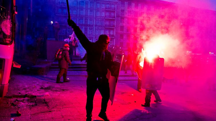 Mit Masken vermummte Oppositionelle hatten zuvor versucht, Absperrungen im Regierungsviertel zu durchbrechen, um das Parlamentsgebäude zu stürmen. Einige warfen Steine auf die Polizisten und zündeten Feuerwerkskörper. Die Sicherheitskräfte setzten Blendgranaten und auch einen Wasserwerfer ein - bei etwa minus acht Grad Celsius. Unbestätigten Augenzeugenberichten zufolge gab es nach dem Einsatz von Tränengas mehrere Verletzte. Ein Bus ging in Flammen auf.