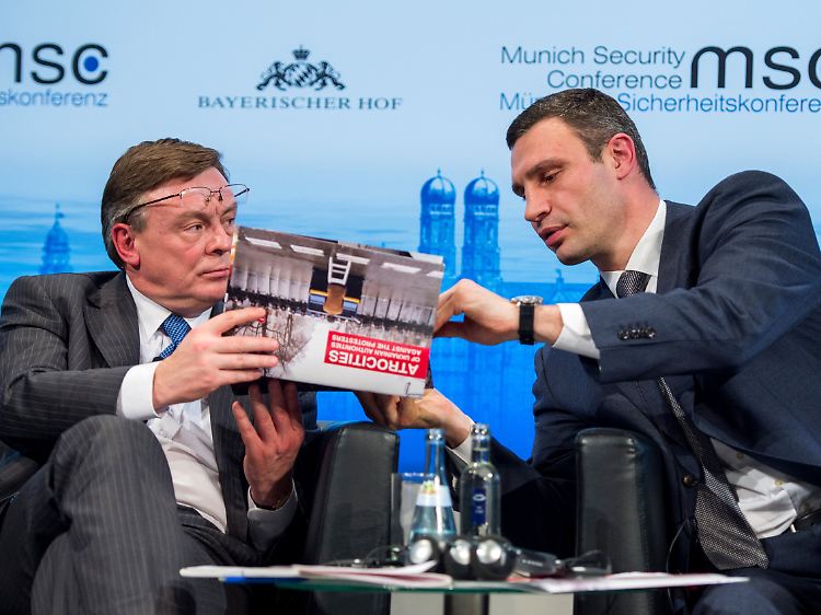 Die Veranstaltung im großen Saal der Sicherheitskonferenz ist der wichtigste, aber bei Weitem nicht der einzige Termin Klitschkos an diesem Tag in München. Er trifft UN-Generalsekretär Ban Ki Moon, US-Außenminister John Kerry und den deutschen Außenminister Frank-Walter Steinmeier. Auch der bayerische Ministerpräsident Horst Seehofer bekommt noch ein Treffen. Zwischendurch schaut Klitschko kurz in der Innenstadt vorbei, wo ukrainische Landsleute demonstrieren.