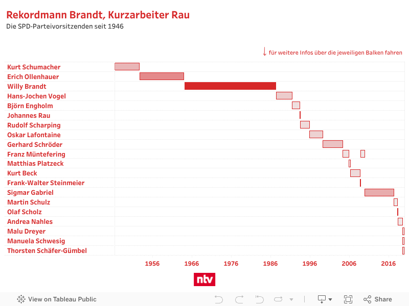 Zur Infografik: Bei der SPD waren seit 1949 insgesamt 20 Frauen und Männer als Parteivorsitzende im Amt. Rekordhalter ist Willy Brandt: Der Mann, der von 1969 bis 1974 als erster sozialdemokratischer Bundeskanzler die Regierungsgeschäfte führte, lenkte die Geschicke der Partei von Februar 1964 bis März 1987.