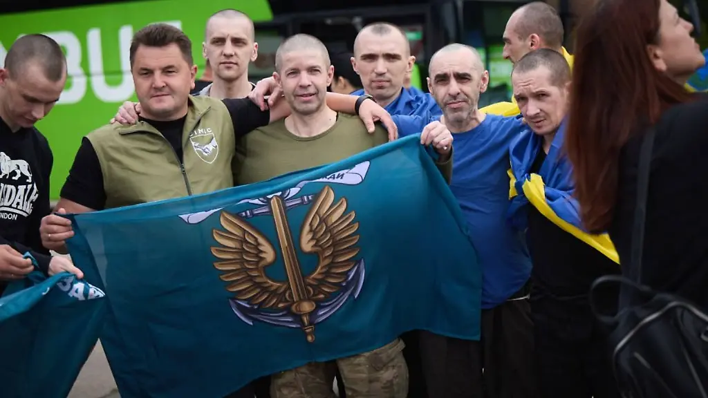 "Wir arbeiten weiter daran, alle aus russischer Gefangenschaft nach Hause zu bringen", erklärte Selenskyj. Er veröffentlichte Bilder der ukrainischen Soldaten - mit rasierten Köpfen und eingehüllt in Nationalflaggen. Russische Staatsmedien zeigten Moskaus Soldaten in Tarnkleidung, die mit Nationalflaggen um die Schultern "Russland, Russland" skandierten.