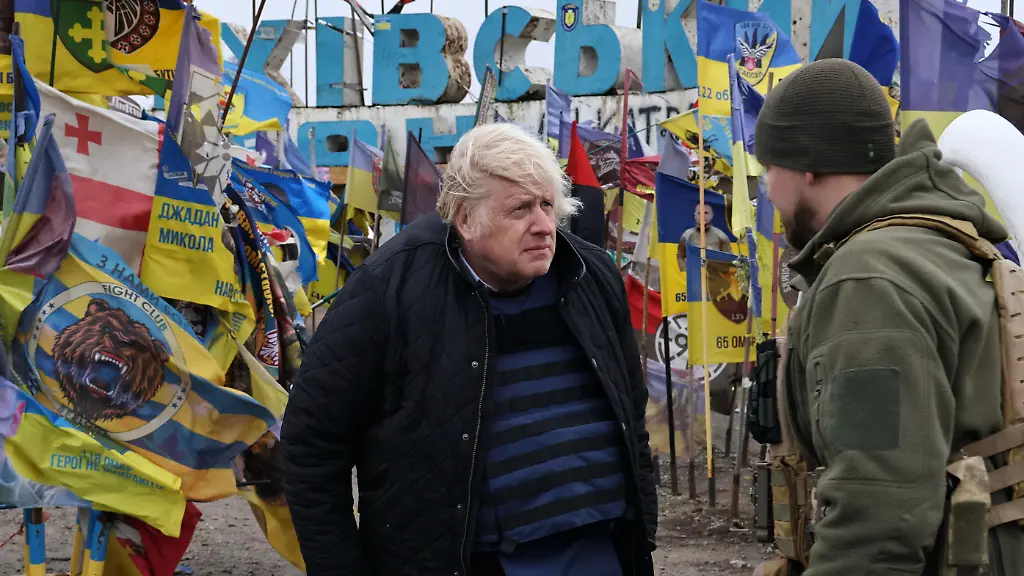 Auf-diesem-vom-Pressedienst-der-65-Mechanisierten-Brigade-der-Ukraine-via-AP-veroeffentlichten-Foto-spricht-der-ehemalige-britische-Premierminister-Boris-Johnson-mit-einem-ukrainischen-Soldaten-am-Ortseingangsschild-umgeben-von-ukrainischen-Nationalflaggen-und-Flaggen-militaerischer-Einheiten