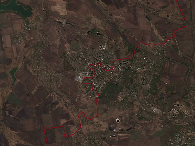 Blick aus dem All auf Torezk: Bildmaterial aus dem europäischen Erdbeobachtungsprogramm Copernicus zeigt das Stadtgebiet im Oktober 2023, überlagert mit dem ungefähren Frontverlauf Anfang Januar 2025 (rote Linie).