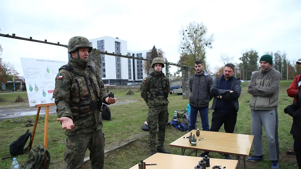 "Ich fürchte, der Ukraine-Krieg ist der Anfang von etwas Größerem. Und bei einem bewaffneten Konflikt will ich nicht weglaufen", sagt Adam Krakowiak. Der 28-jährige Gabelstaplerfahrer überlegt, ob er Berufssoldat werden oder dem freiwilligen Heimatschutz beitreten soll. Das Training soll ihm bei der Entscheidung helfen. Draußen auf dem Übungsgelände erklärt Feldwebel Mariusz Starosz den Umgang mit der Handgranate. "Nach dem Werfen sofort in Deckung gehen, nicht gucken, wo sie landet!", schärft er den Teilnehmern ein.