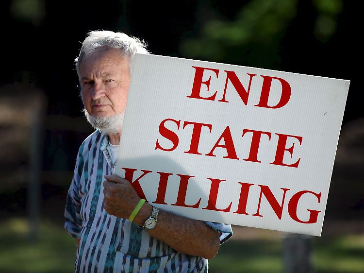 Ed Weir protestiert mit seinem Plakat außerhalb des Gefängnisses in Jackson in Georgia gegen die Hinrichtung eines Insassen.