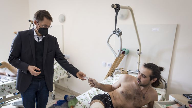 Lauterbach spricht mit einem Verwundeten in einer Klinik in Lemberg.