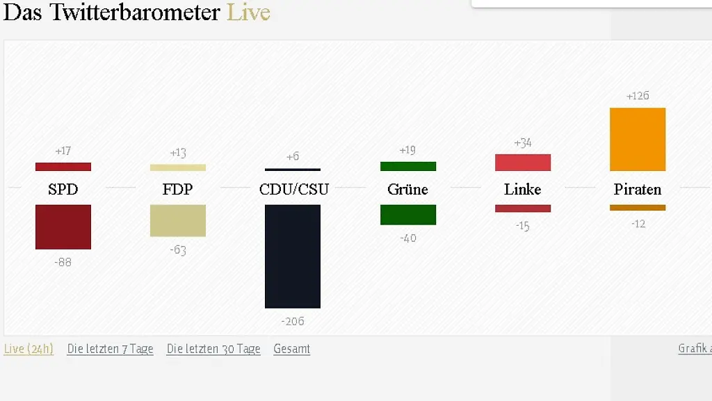 Man muss schauen, wie das zustande kommt: Die Piraten haben sich definitiv am schnellsten auf dieses Tool eingestellt. Ich glaube aber, das wird sich nach und nach durch alle Parteien ziehen und dadurch ein bisschen aufspreizen. Wenn erst einmal ein gewisses Grundrauschen da ist, wird man deutlich merken: "Oh, heute hat die CDU viele Positiv-Tweets gehabt, das liegt vielleicht an dieser einen Ansprache von Angela Merkel." Oder, wenn es innerhalb weniger Stunden viele negative Tweets zu den Grünen gib, hängt das wohl damit zusammen, dass sie an diesem Tag ihre neuen Steuerpläne vorgestellt haben. Das Barometer gibt ein schnelles und situatives Meinungsbild, das ist der Vorteil gegenüber den klassischen Umfragen. Unser Ziel ist es nicht, eine Prognose für die Bundestagswahl abzugeben.