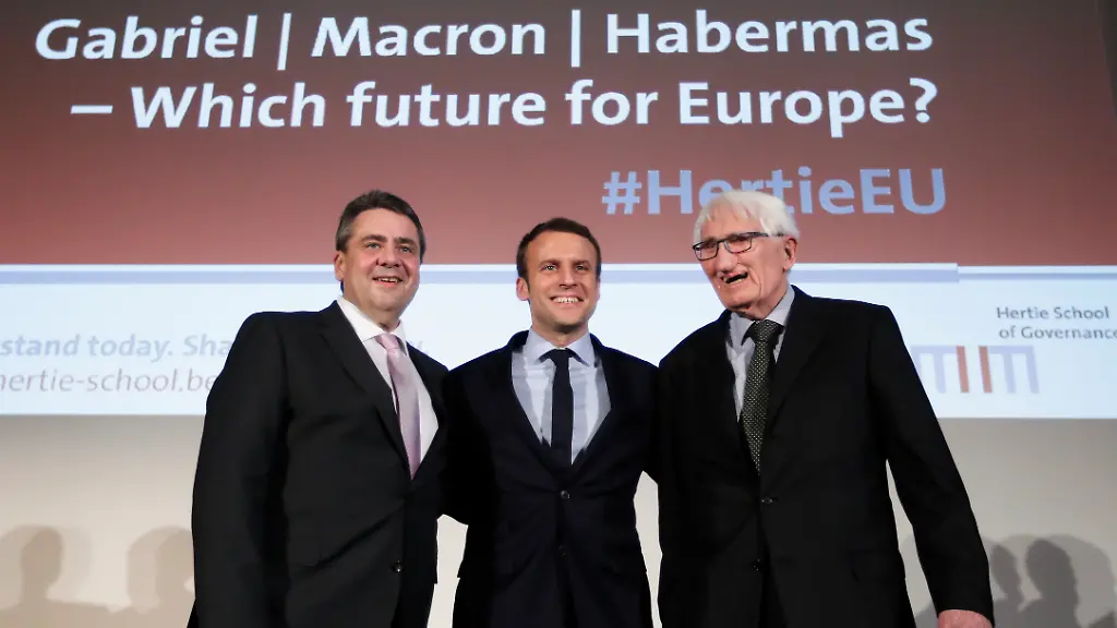 Emmanuel Macron guckt fast ein bisschen schüchtern, als er zusammen mit Sigmar Gabriel und Jürgen Habermas den Saal betritt. Auf der Bühne lächelt er dann, wie Politiker dies eben tun, während die Fotografen Bilder von den dreien machen, Macron in der Mitte, zwischen dem deutschen Außenminister und dem 87 Jahre alten Denker.