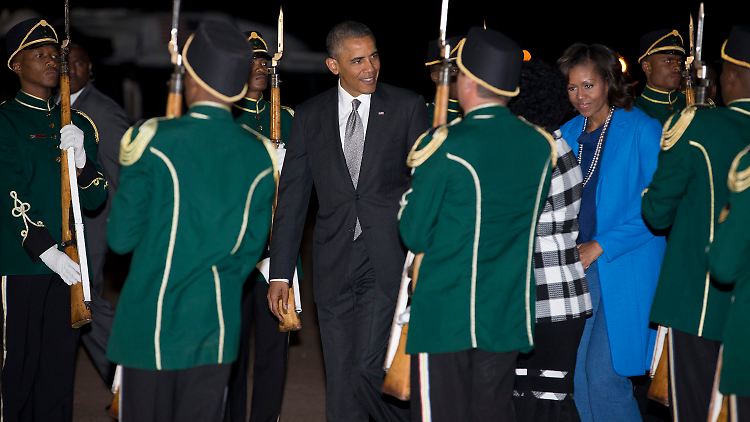 Obama sagte bei der Ankunft in Südafrika, er bestehe nicht auf einem gemeinsamen Foto. "Das Letzte, was ich will, ist der Familie im Wege stehen." Er werde sehen, wie die Lage vor Ort sei, sagte Obama. Die Botschaft, die er zu überbringen habe, gehe ohnehin an Mandelas ganze Familie. "Es ist einfach eine tiefe Dankbarkeit für seine Führung in all den Jahren." Die Gedanken und Gebete der US-Bevölkerung seien bei ihm.