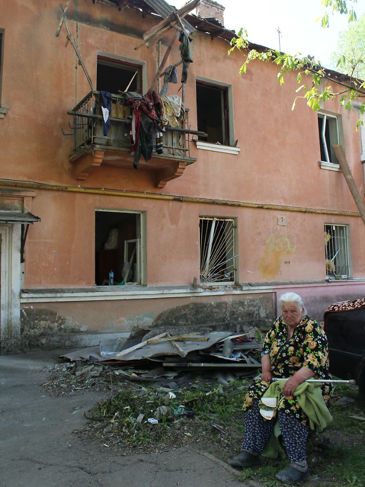 "Sascha!", ruft Lyubov nach ihrem Sohn: "Er ist hier irgendwo." Er war es, der sie aus der Wohnung im zweiten Stock herausholte. "Ich spürte die Explosion und alles kam auf mich zugeflogen", erinnert sie sich. Dann fand sie sich unter Fensterrahmen, zerborstenem Glas und jeder Menge Staub wieder. "Sie riefen nach mir und zogen mich raus". Die Frau blieb unverletzt. Seit ihrer Rettung sitzt die Rentnerin mit einem Gehstock vor dem Haus auf einem Hocker und wartet ab.