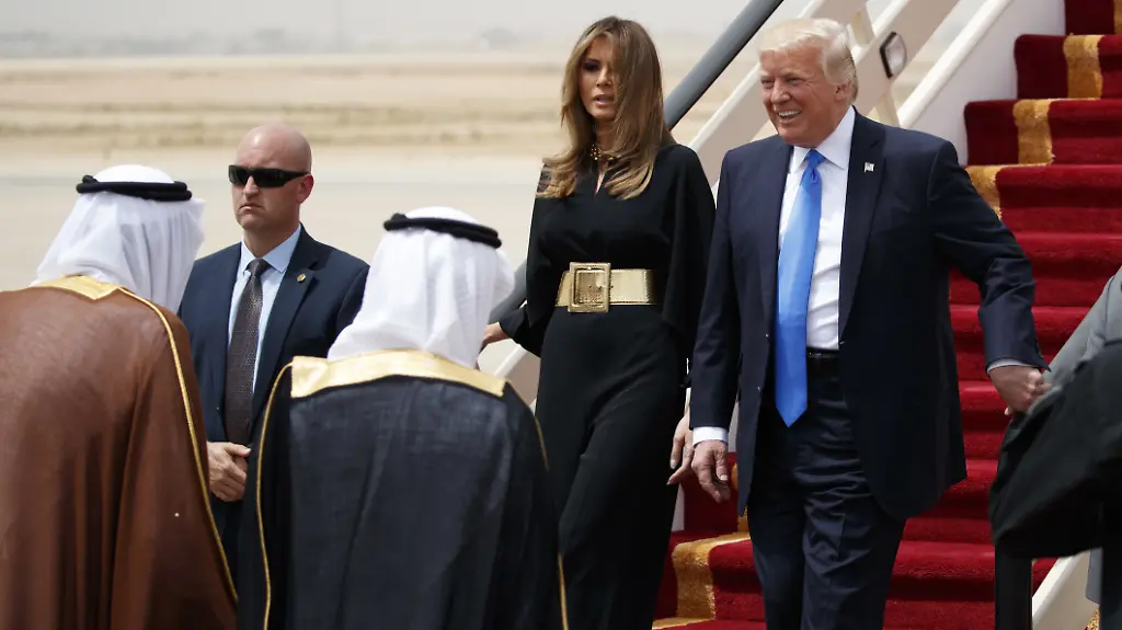Ansonsten bemühte sich Melania Trump weitgehend, den strengen saudi-arabischen Kleidervorschriften gerecht zu werden. Sie trug einen schwarzen Hosenanzug, der sowohl Arme wie auch Knöchel bedeckte, und einen breiten goldenen Gürtel. Donald Trumps mitreisende Tochter Ivanka präsentierte sich den Fotografen in einem hochgeschlossenen schwarzen Kleid mit Blumenaufdruck - und ebenfalls mit offenen Haaren.