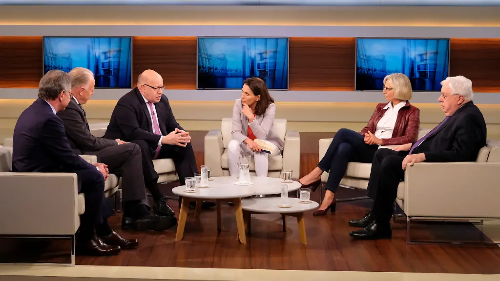 Im Studio Platz genommen haben Bundeswirtschaftsminister Peter Altmaier (CDU), Industrieverbandschef Dieter Kempf, Jürgen Trittin von den Grünen, die "Spiegel"-Journalistin Christiane Hoffmann sowie der ehemalige US-Botschafter in Deutschland, John Kornblum.