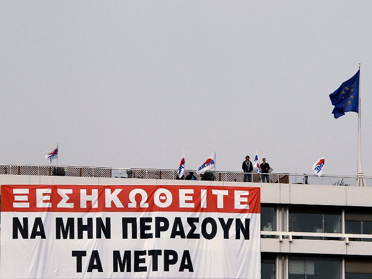 Protestaufruf auf dem Dach des Finanzministeriums in Athen, die Sparmaßnahmen zu verhindern.