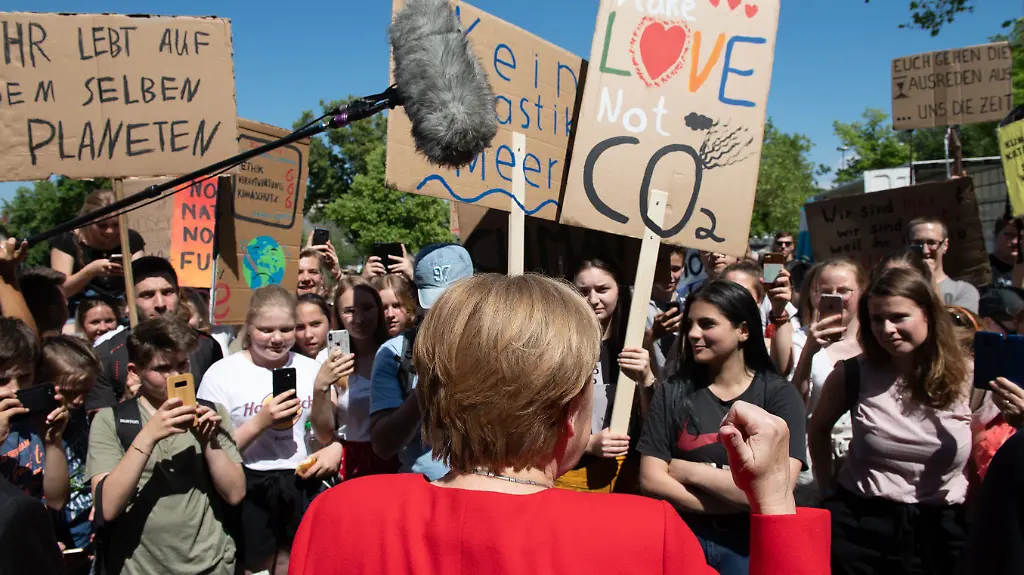 Vor der Diskussionsrunde hatten Dutzende Schüler am Rande des Besuchs für mehr Ehrgeiz der Bundesregierung beim Klimaschutz demonstriert. Unter den Demonstranten war auch Luisa Neubauer von der deutschen "Fridays for Future"-Bewegung. "Wir wollen, dass ihr handelt", skandierten die Teilnehmer. Ebenso war zu hören: "Wir sind hier, wir sind laut, weil ihr uns die Zukunft klaut."