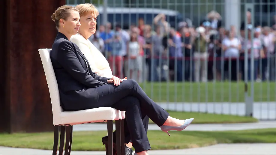 Die CDU-Politikerin und die dänische Ministerpräsidentin saßen beim Abspielen der Nationalhymnen auf Stühlen mit weißem Stoffbezug vor dem Kanzleramt. Die Stühle standen auf einem kleinen Podest, von dem aus die Kanzlerin und ihr jeweiliger Gast die Nationalhymnen normalerweise im Stehen anhören.